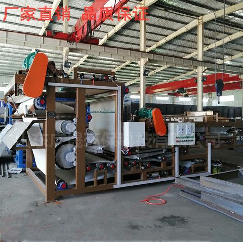 钻井泥浆处理设备是通过两条滤带缠绕在一系列顺序排列、大小不等的辊轮上,利用滤带间的挤压和剪切作用,来脱除料浆中水分的一种压滤设备,具有着能连续作业、自动化程度高、节能、使用维护方便等优点,是一种进行污泥脱水减量化处理的理想设备。