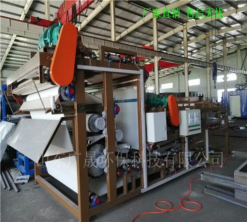 滤带式污泥脱水机通过两条滤带缠绕在一系列顺序排列、大小不等的辊轮上,利用滤带间的挤压和剪切作用,来脱除料浆中水分的一种压滤设备,具有连续作业、自动化程度高、节能、使用维护方便等优点。